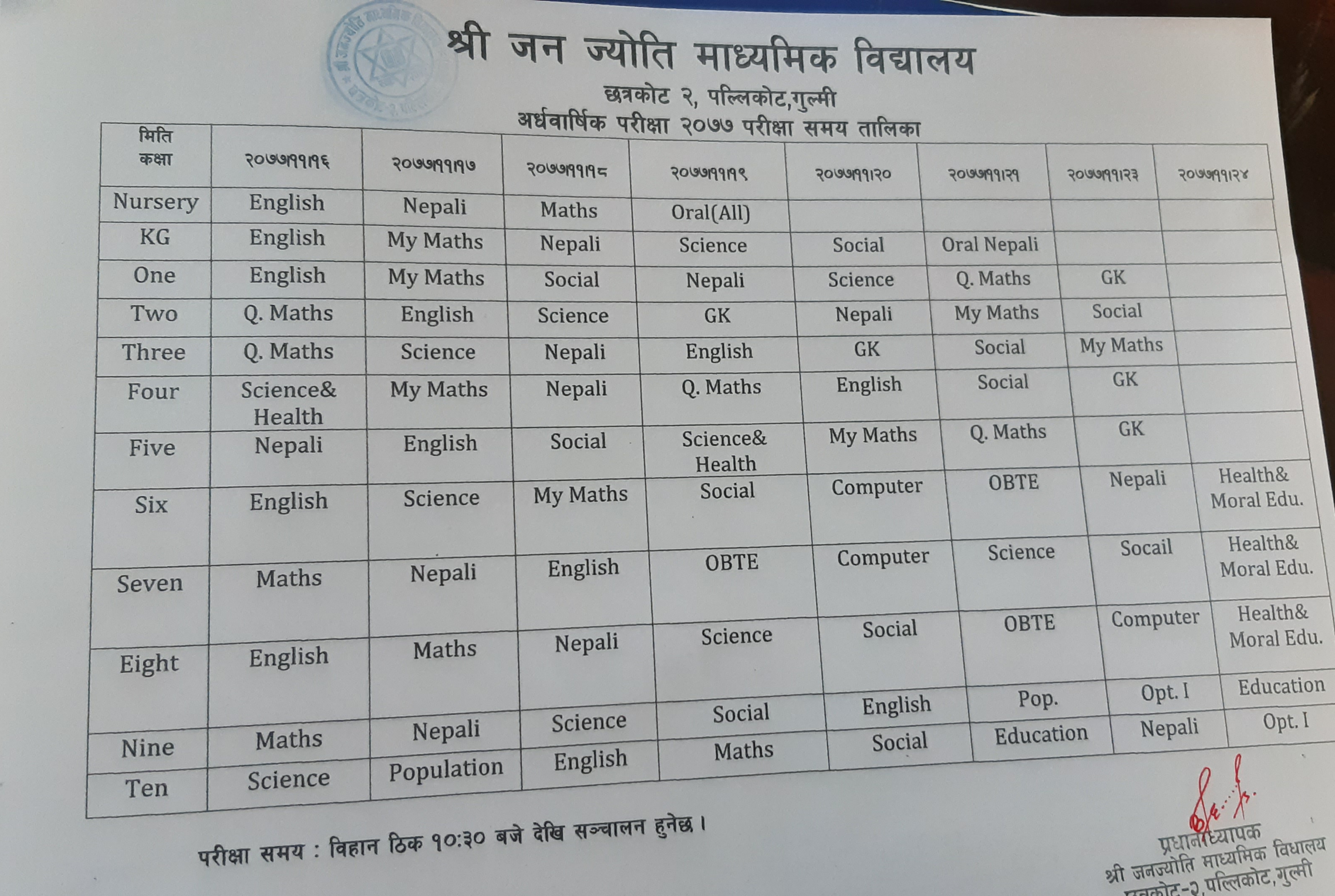Half Yearly Examination Schedule 2077